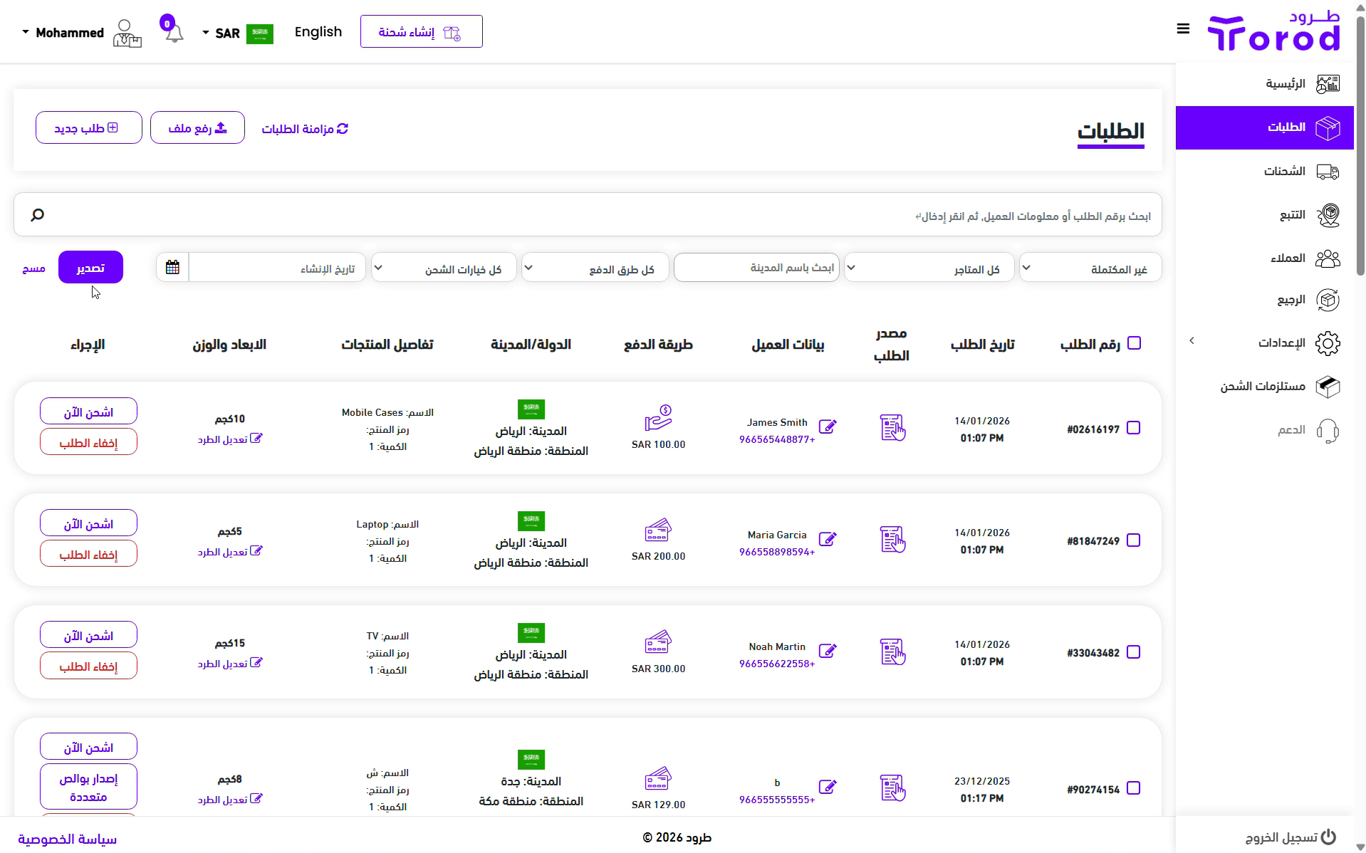 تصدير الطلبات